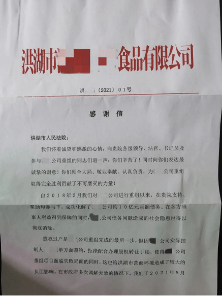11月3日,荊州市洪湖法院收到洪湖市某食品有限公司送來的感謝信,對洪湖法院成功化解上億元股權(quán)轉(zhuǎn)讓糾紛、幫助企業(yè)重組落地表示感謝。
