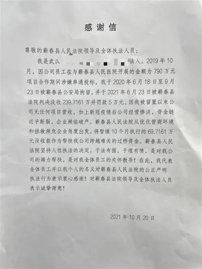 近日,黃岡市蘄春法院收到一封來(lái)自武漢某公司的感謝信,感謝蘄春法院執(zhí)行局在執(zhí)行一件涉及武漢某公司的案件中,對(duì)企業(yè)進(jìn)行經(jīng)濟(jì)風(fēng)險(xiǎn)評(píng)估,采取文明理性、善意執(zhí)行的措施,解決了企業(yè)的資金周轉(zhuǎn)難題。