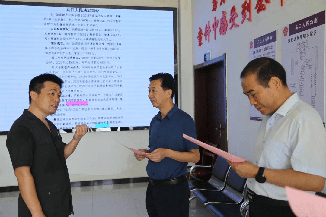 赴孝感中院開展驗收評估工作當天,驗收組隨機抽取了漢川法院作為基層法院進行驗收。在漢川法院,驗收組一行實地查看馬口人民法庭、城北人民法庭的規范化建設情況,并與漢川法院院長進行座談。
